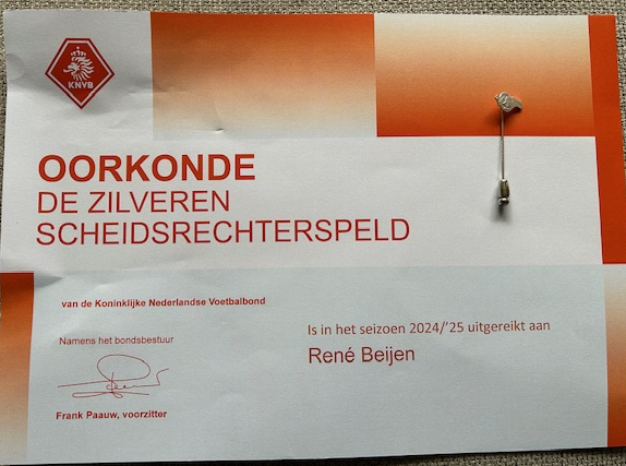 Daarnaast mocht ik mijn oorkonde en bijbehorende Zilveren Scheidsrechterspeld in ontvangst nemen.